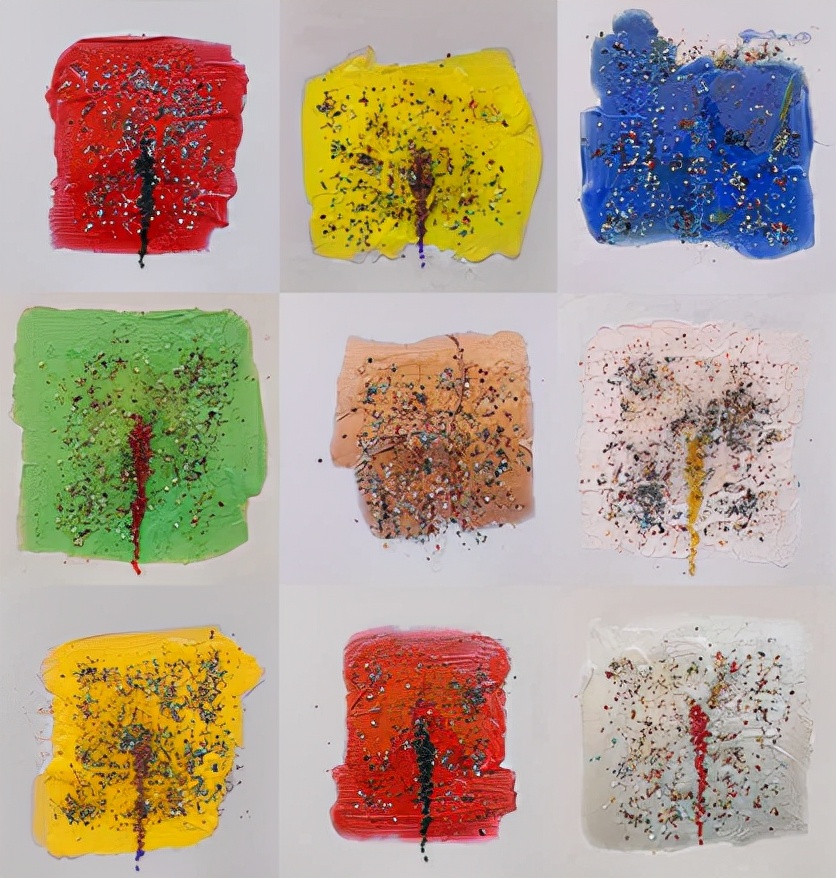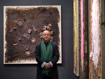 這次展位呈現(xiàn)的“禪茶一味-春夏秋冬”系列,藝術(shù)家將不同時(shí)節(jié)的花茶加入創(chuàng)作當(dāng)中,輔以日曬、霉變、火燒等自然力量,使得它們以新的肌理凝固在畫布上。茶,在藝術(shù)家大憨的手上,以一種全新的畫相展示其新的生態(tài)之美。
