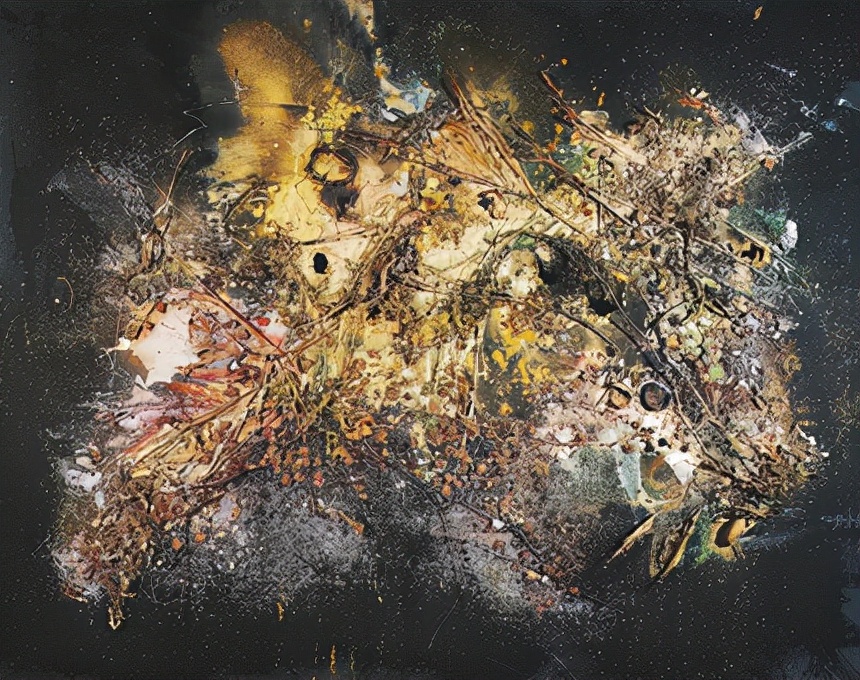 看作品中,藝術(shù)家在深色水墨的背景上用點(diǎn)點(diǎn)金粉點(diǎn)亮畫面,寓意在浩瀚無垠的宇宙中所透出的智慧之光,磅礴而深邃。