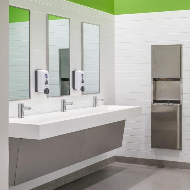 另外,感應式設施由于其免觸摸的特性,不必擔心學生們的錯誤使用,減輕了設備維護人員的負擔。建于1950年的美國韋斯特伍德小學在近期建設新教學樓的過程中,知道它需要配備頂級的衛生間設備,以供數百名孩子、教師和工作人員的日常使用。所以,為新樓和新設施選擇衛生間產品時,他們選擇在校內的所有衛生間內都安裝免觸感應水龍頭,這些免接觸、感應式水龍頭采用了帶自動自適應傳感器技術的雙紅外線傳感器,有效防止學生對洗手設施的損壞,比普通水龍頭更耐久。