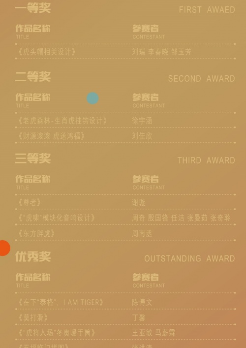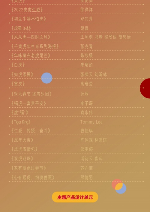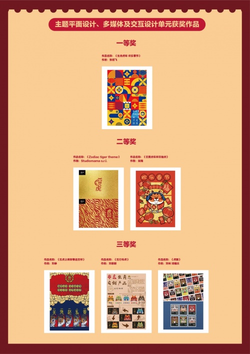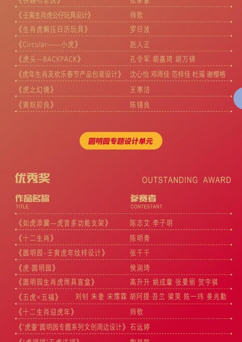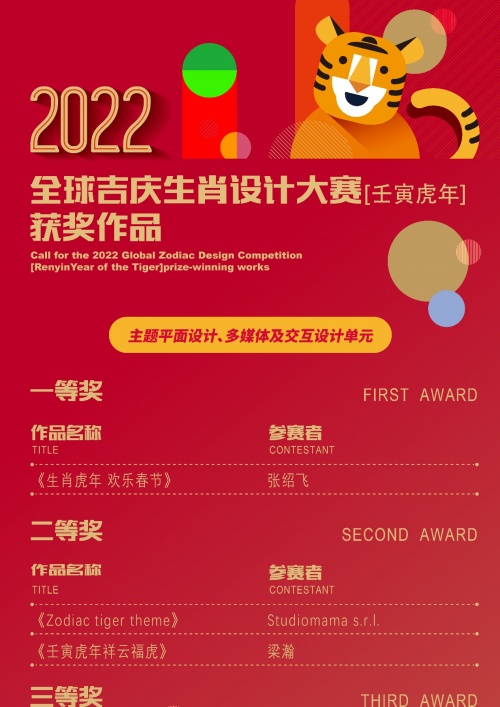 作品經過層層評選,87件作品最終脫穎而出,在2022全球吉慶生肖設計大賽(壬寅虎年)比賽中獲獎。其中,《生肖虎年 歡樂春節》、《虎頭帽相關設計》分獲主題平面設計與多媒體及交互設計單元、主題產品設計單元一等獎。設計作品獲得平面設計及多媒體交互設計單元獲獎作品共計36件;主題產品設計單元獲獎作品共計36件;圓明園專題設計單元獲獎作品15件。獲獎作品緊扣生肖——虎的概念和文化內涵,結合將生肖文化進行了創新化、國際化、時尚化和多元化表達,成為傳播生肖文化的重要形象載體。