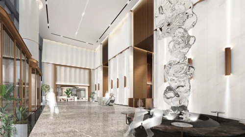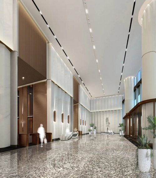 KWG商業(yè)設(shè)計(jì)團(tuán)隊(duì)與知飾設(shè)計(jì)共同定制設(shè)計(jì)了5A寫字樓這座31層建筑的大堂、主廳、零售區(qū)域、標(biāo)準(zhǔn)層的設(shè)計(jì)方案,并為公共空間的設(shè)計(jì)建立了新的尺度及標(biāo)準(zhǔn)。墻身運(yùn)用大理石折疊錯(cuò)落的肌理感盡顯室內(nèi)大堂的設(shè)計(jì)磅礴大氣,身臨其境可體驗(yàn)空間的豁然放飛及尖端品位的空靈之感。