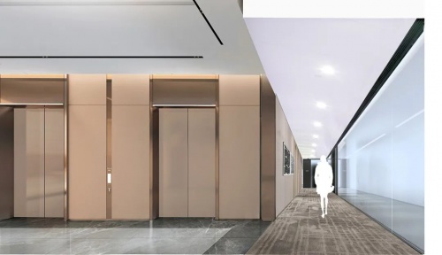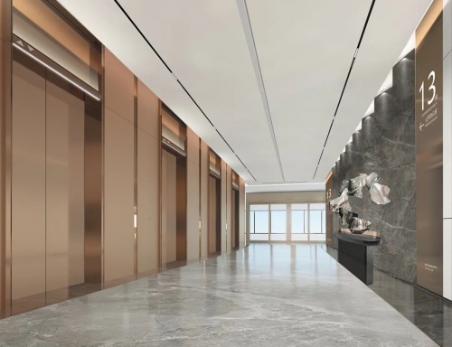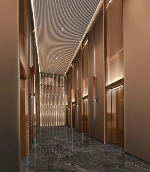 電梯大堂立面的復(fù)雜折疊賦予了材質(zhì)之間不同定點(diǎn)的獨(dú)特連接。為了在視覺上使立面更纖細(xì)和統(tǒng)一,團(tuán)隊(duì)設(shè)計(jì)了精巧的金屬外殼系統(tǒng),在同色古銅金屬材質(zhì)采用不同紋理及肌理搭配,完美地整合了結(jié)構(gòu)連接的視覺弱點(diǎn)。纖細(xì)的設(shè)計(jì)語言突出視覺高度,回應(yīng)了幕墻的古銅色和高品質(zhì)愿景。